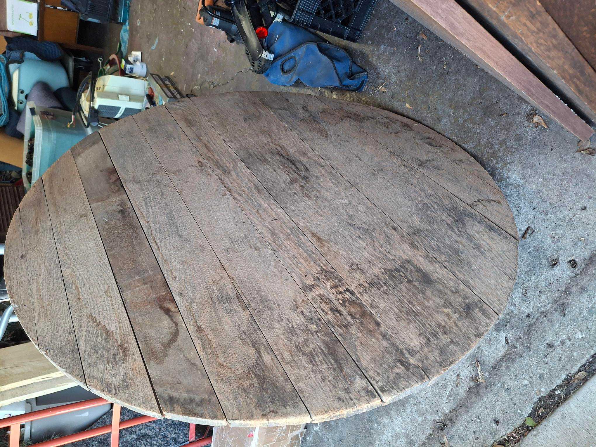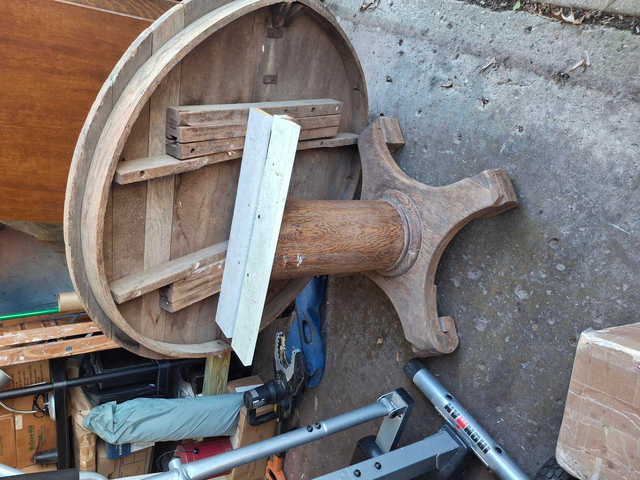 Solid oak pedestal table. Needs some love to make it beautiful. 43" diameter. Approximately 2' tall.
