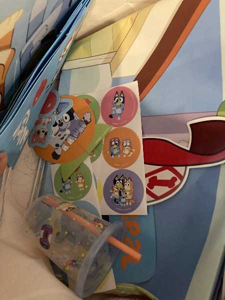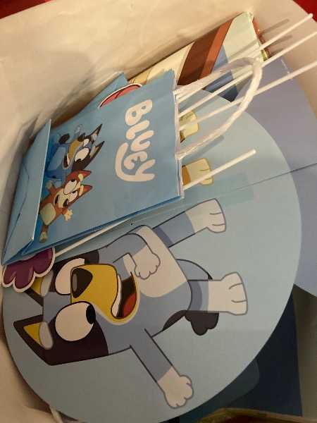 Bluey decor includes a few party favor bags, stickers, large backdrop of the Heeler house for a photo booth plus fun props, table top decor.