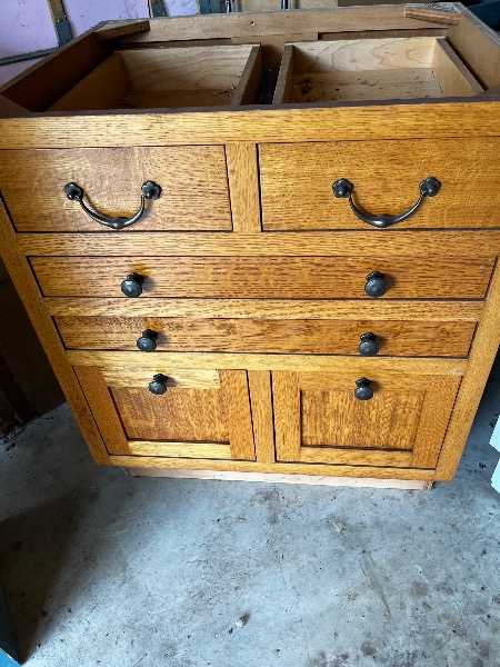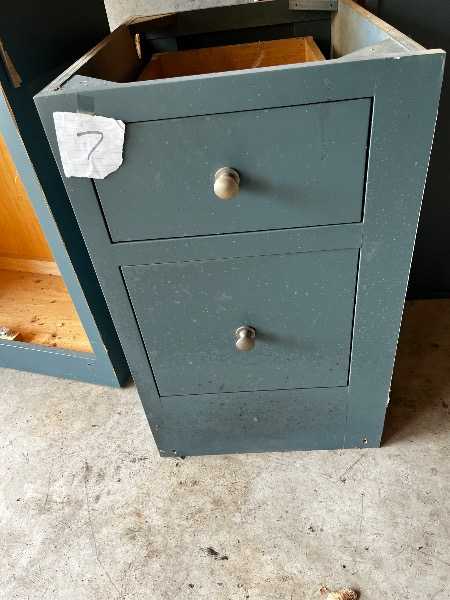 Multiple cabinets that once filled a cabinet showroom. Two main colors. You will need to make a couple of trips with a pickup. Some cabinets are pristine; others need some love.