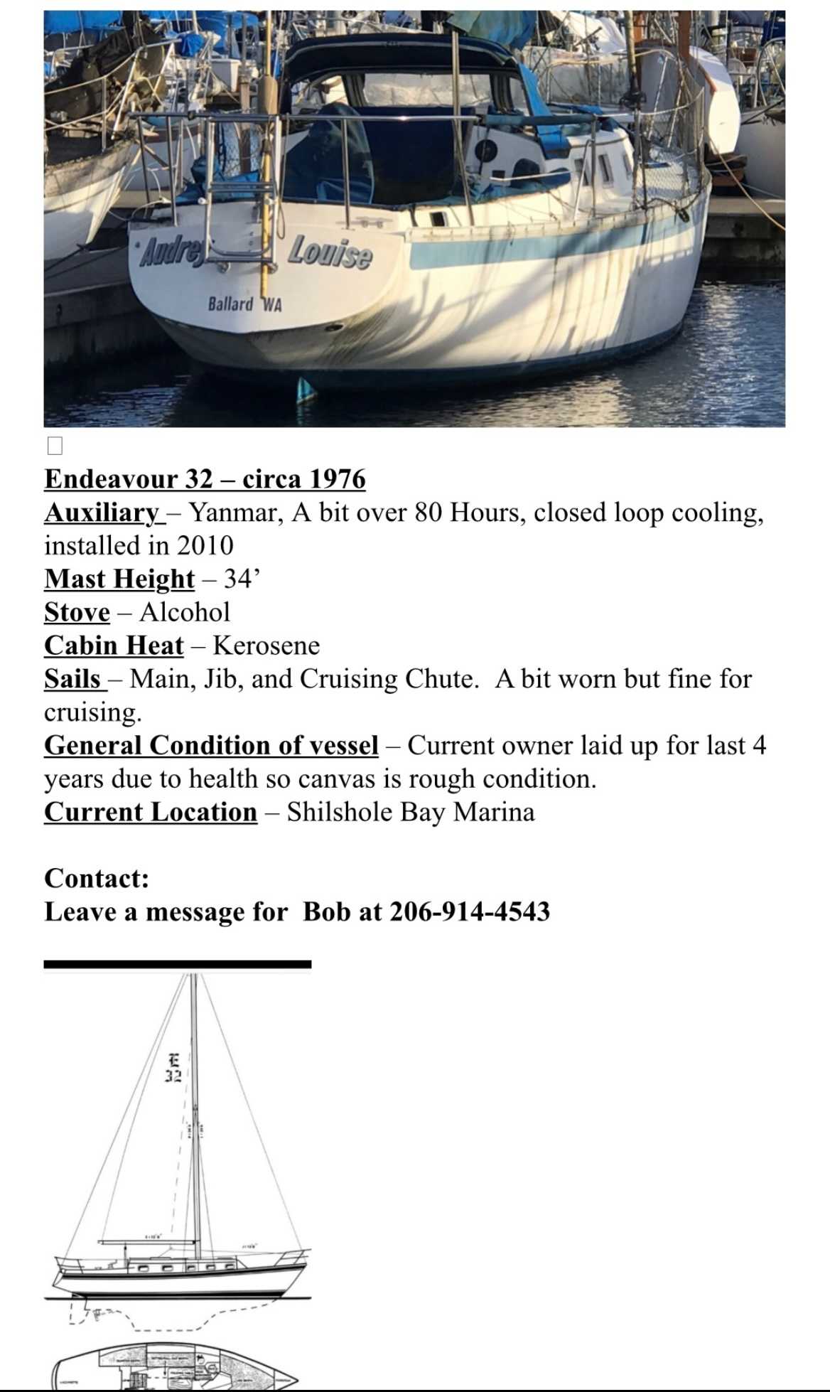 1978 Fiberglass 32 Endeavour Sloop. Newish engine has less than 90 hours on it.  Blue canvas in rough condition. Some minor work needed on galley sink. Owner facing health issues and needs to get this sweet sailboat a new home.