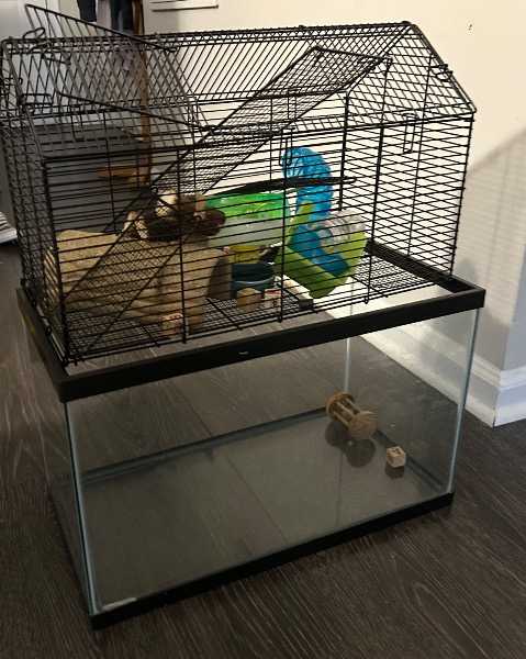 2-story hamster cage and equipment, used and sanitized. 20" by 10"