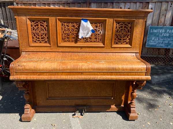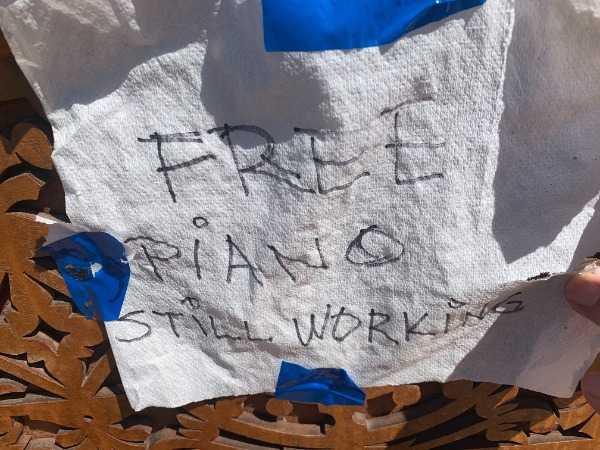 Saw this upright piano in the back parking lot with a "Free" sign on it. Some wear and tear on the finish, but all the keys appear to work.