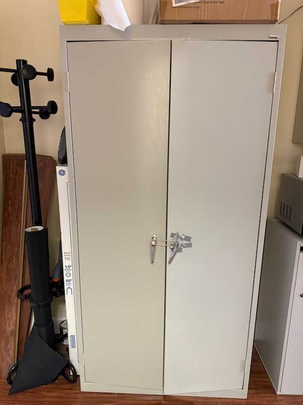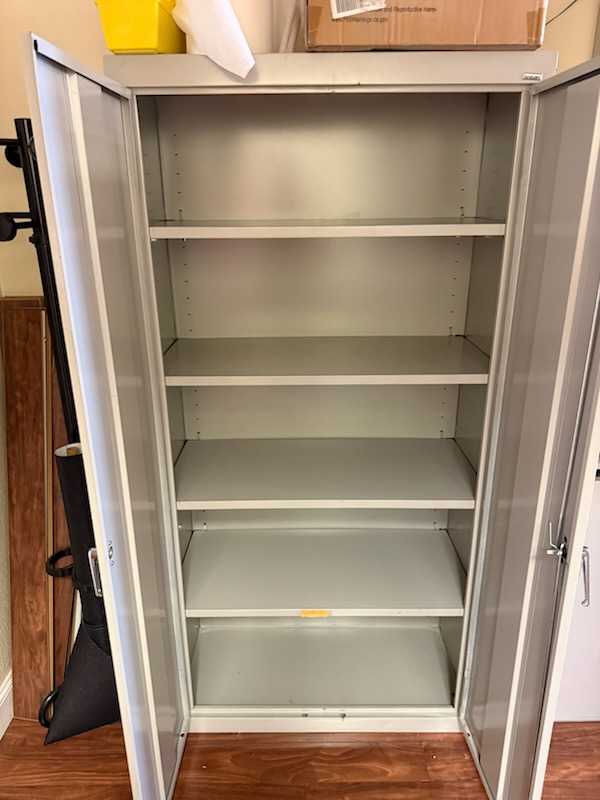 Sandusky 36in wide shelf stoarage cabinet. No Key. Door handle needs to be fixed. Would need a dolly. 36w, 72h, 18d