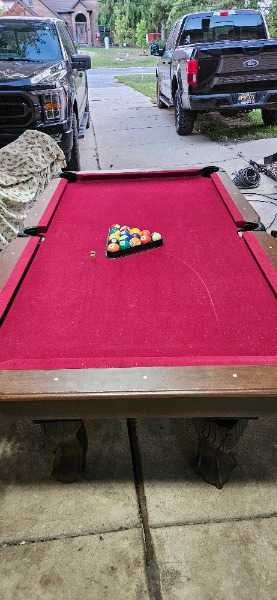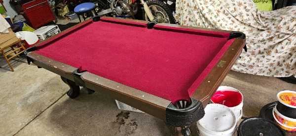 Free pool table. Includes balls and 4 sticks with wall storage unit for the sticks. A leg is broke on the table that needs to be fixed but it can still be used in the meantime just be careful if you try to move the table.