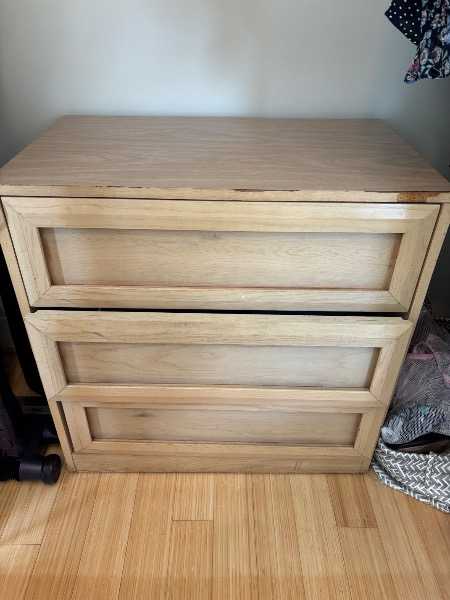 3-drawer dresser. Drawers are a little finnecky/ one doesn't fully close but think it can be repaired/ get back on track.