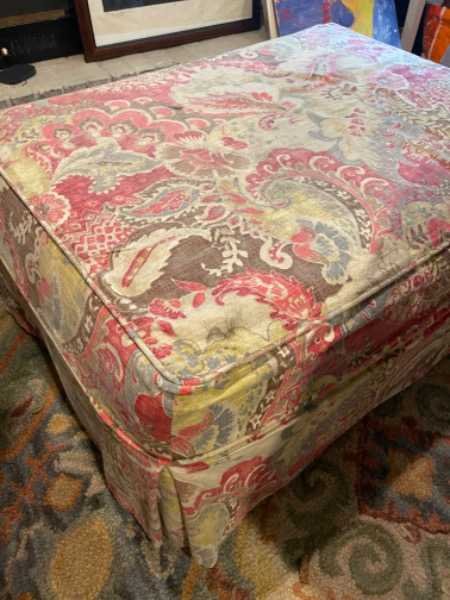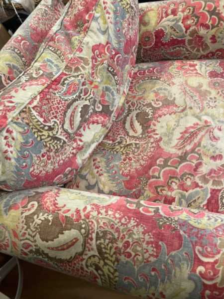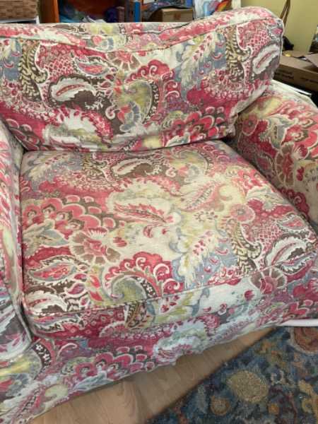 We have loved this chair, it's big and comfy. Easily fits two children or two small/med sized adults. washable slipcovers, no stains/rips/tears/cat damage. original owner dried chair slipcover on high heat, caused shrinkage, back of slipcover is open. This didn't bother us so i never attempeted to stretch the slipcover to close completely, I sun dried the slipcovers, laid flat outside. We have cats who also love this chair and ottoman. The slipcovers cat hair will be brushed off, not freshly washed, act accordingly. chair back cushion is floppy, i added poly fill stuffing, it'll spill out when cover is removed.