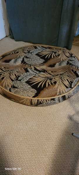 Large round dog bed approximately 40 inches across and 6 inches deep; very good condition.  Cover zips off for laundering.  Also includes an extra cover.  Both covers have been washed and are clean.
