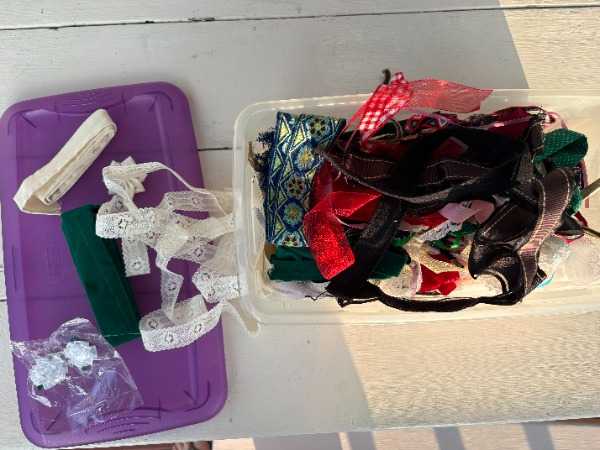 Still available!!  Plastic shoe box full of miscellaneous trim and do-dads.
