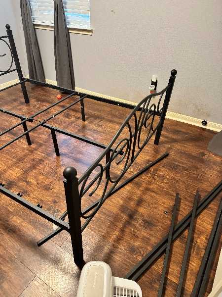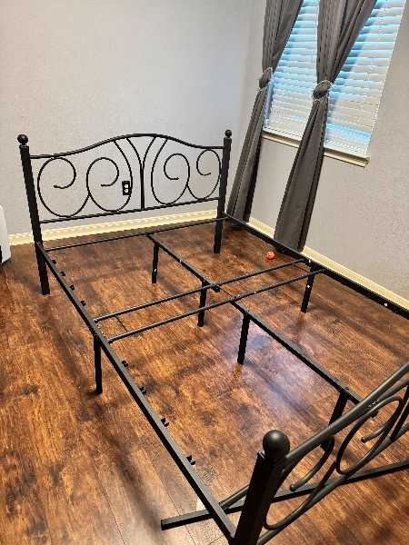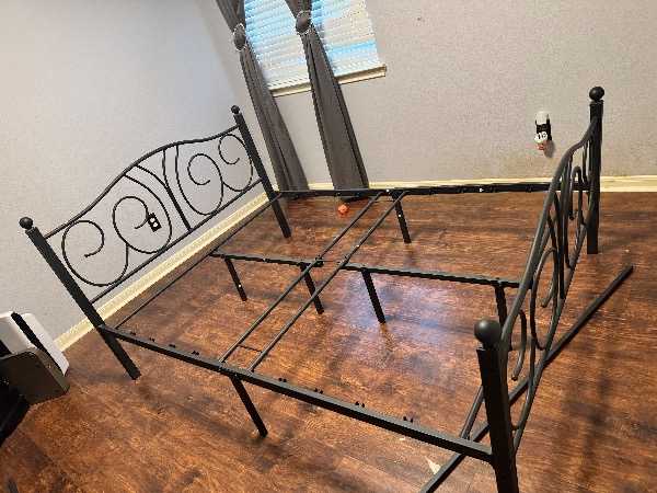 Full-sized iron guest room bed. Comes from a home with pets. I started dismantling before taking pictures, but all parts and hardware are included. Available for pickup in the Westfield Subdivision. First person who can pick up soonest gets it. Will NOT fit in regular sized vehicle. I recommend a pick up or mini van