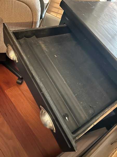 Back of the desk is open and drawer compartments are exposed. Desk is meant be pushed up against a wall.