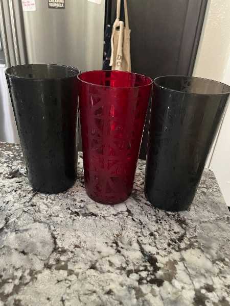 3 large cups in black and red. Plastic material, dishwasher safe, great condition. Holds about 24oz. each.