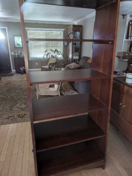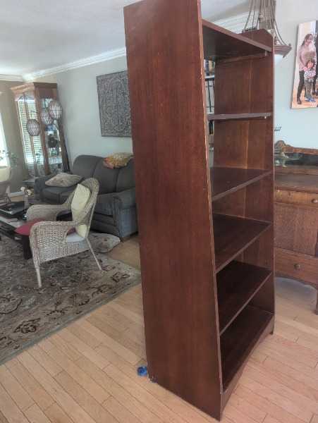 Very sturdy bookshelf with a cherry finish. 76" tall x 32" wide. Top shelf is 14" deep and the shelf sizes gradually get deeper to 19" at the bottom shelf.