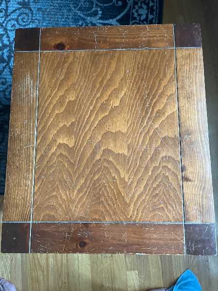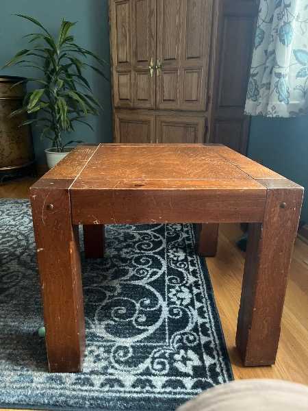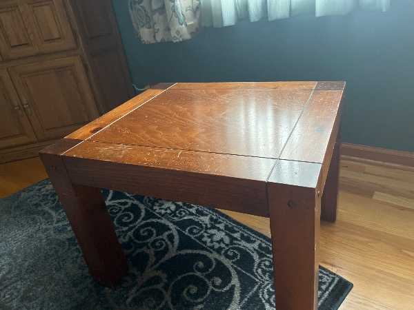 Solid Wood Coffee Table & 2 Matching End Tables.  Normal wear with scratches. Since solid wood they can be covered with dark wood scratch cover polish.  End tables are approximately 24"x28".