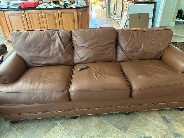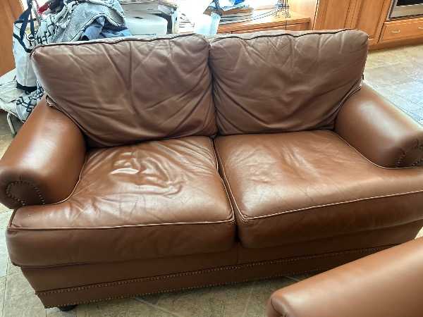 Brown leather sofa and love seat. Sofa is  85”x36”, love seat 62”x36”.  Pick up in North Acton
