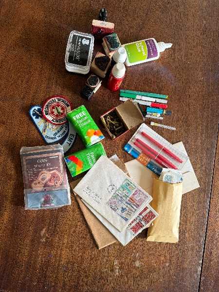 Some stamps that are dog paws and such. Ink pads that work as well as ink refills. Staple remover. Some markers. Tissues. Some of those things you used to make pinwheels in kindergarten A coin wallet kit out of leather that has to be assembled. It's some vintage EMT badges. Some stamps if anyone knows a stamp collector