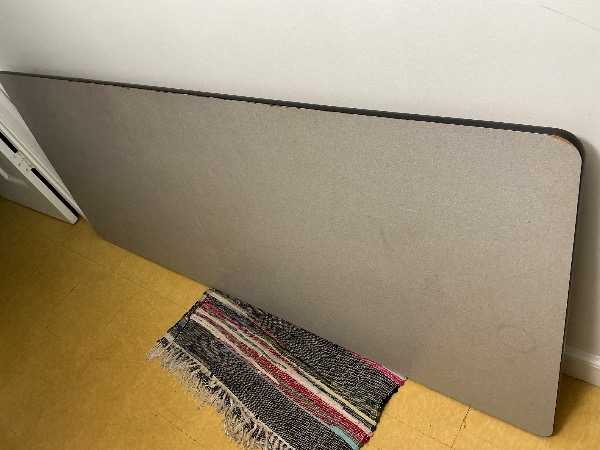 This table has been a great craft table 6 ft by 30 inches. It has some wear but it is strudy and in good shape. Metal foldable legs. I am downsizing stuff that has become heavy for me to move around. Photo not the best I have ever taken. It is flat and sturdy.