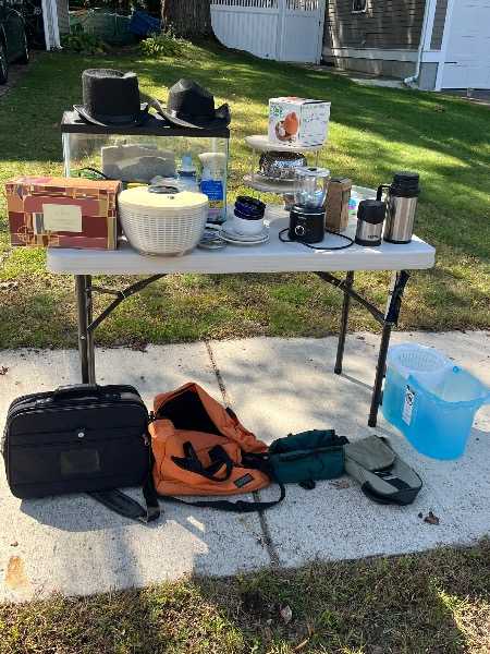 Lots of free stuff: fish tank with all parts (please take all), kitchen ware, hats for Halloween, bags and more! Table NOT included.