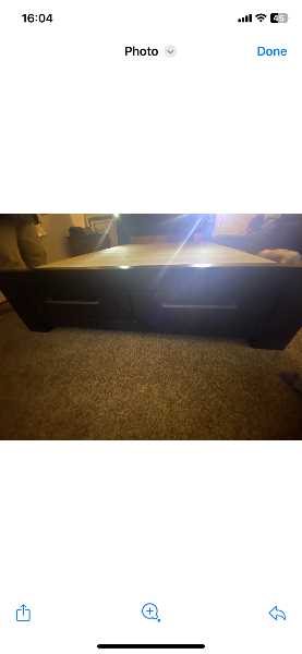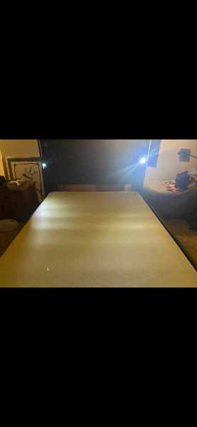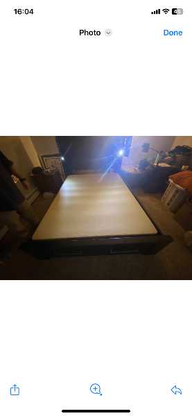 Queen size platform bed frame. Two lights and small shelf in the headboard. Two drawers in the footboard.