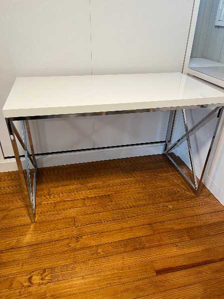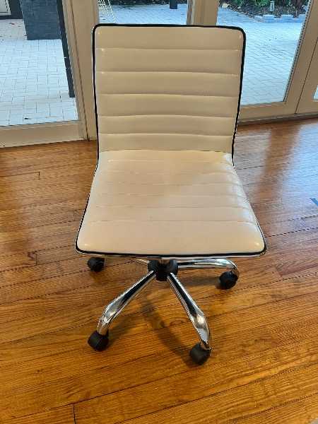 White and silver desk, white and faux marble top filing cabinet, and white leather office chair, all in good shape (a few cat claw marks on the back of the chair but otherwise looks great).