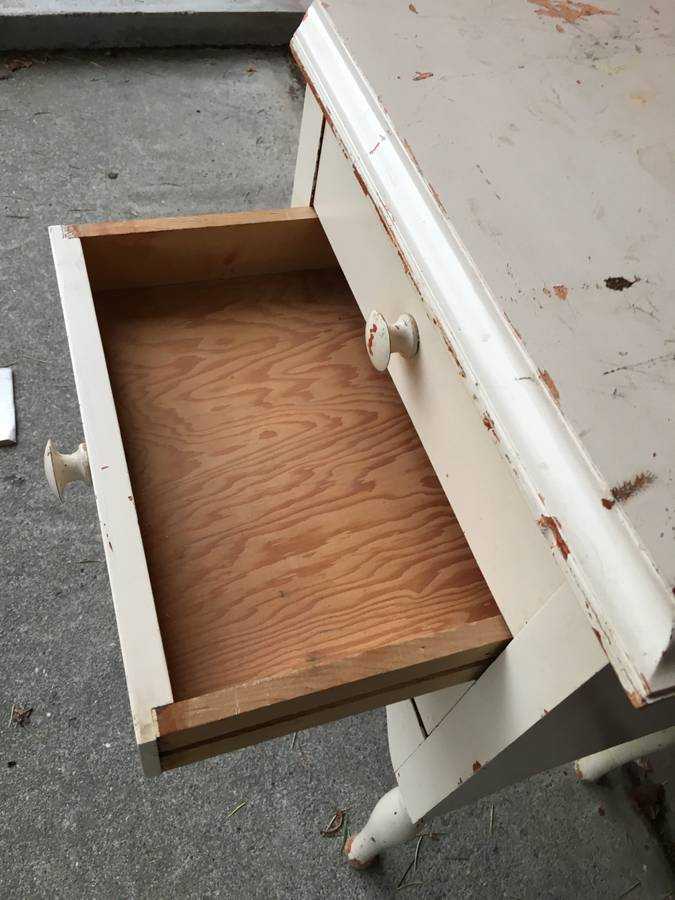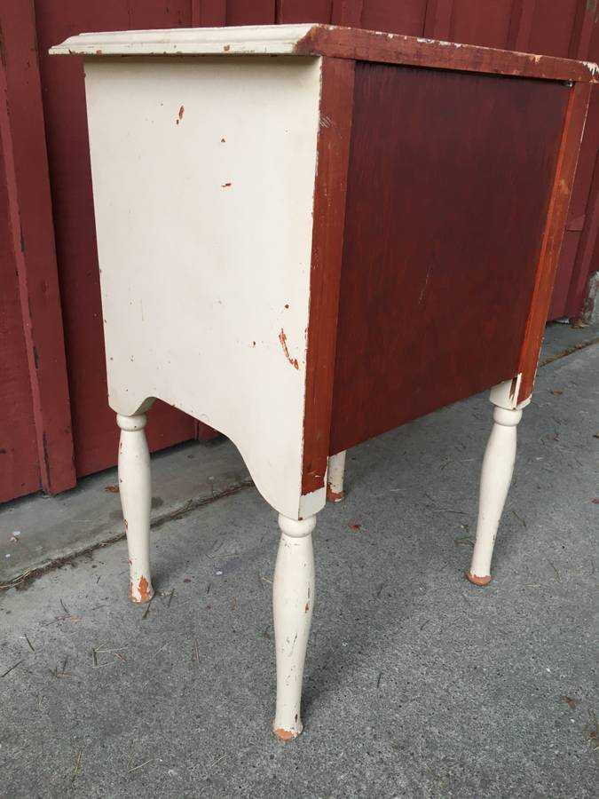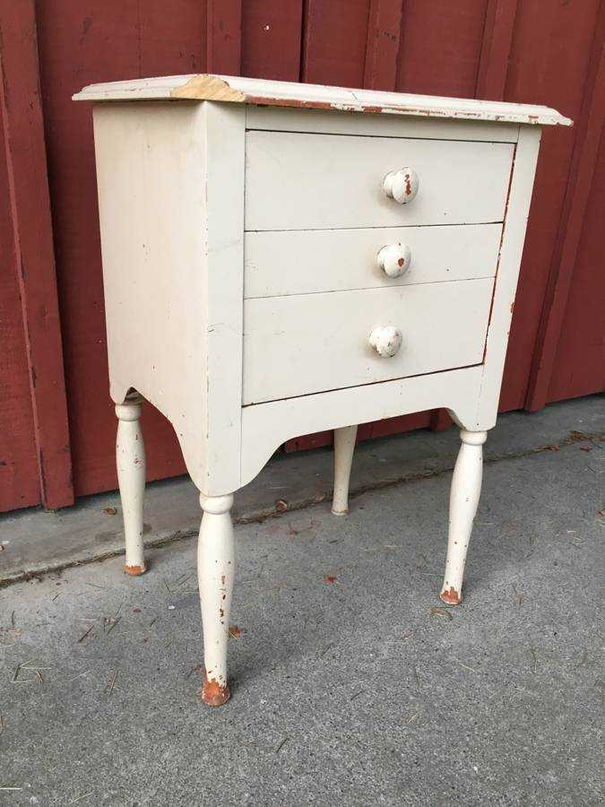 I'm offering a solid wood accent cabinet, painted white, with three drawers. The drawers work fine. It's painted white on three of the four sides, with plenty of scratches, wear and tear. Dimensions: 18 3/4" wide 14" deep 27 1/8" tall. One of the top corners is cut back a bit, presumably to prevent accidental damage to humans passing by.