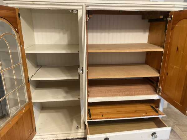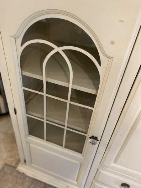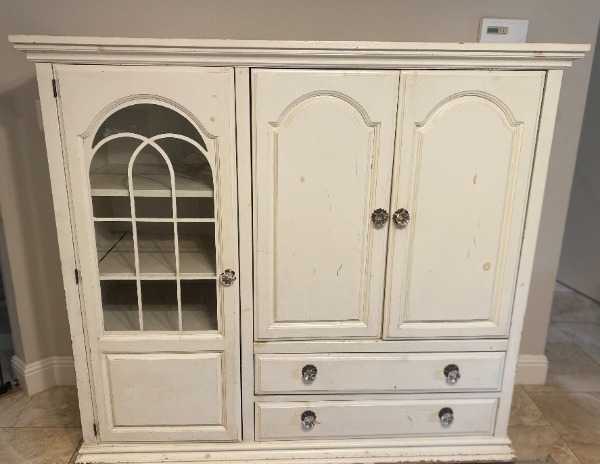 Fantastic piece for extra storage (pantry) in kitchen, dining room or bedroom. Repurposed, chalk painted TV cabinet - shelves installed, glass added providing display option. Heavy, substantial piece of furniture, you will need 2 people to move it, please! 55 1/4” high 22 1/4” deep 60 1/4” wide