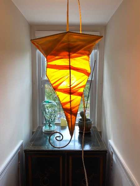 Looks like an upside down "sorting hat" from Harry Potter. Appox 18" from rim to spiral tip. You adjust the length by knotting the cord. In line on/off switch.