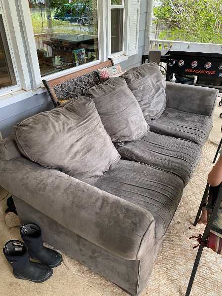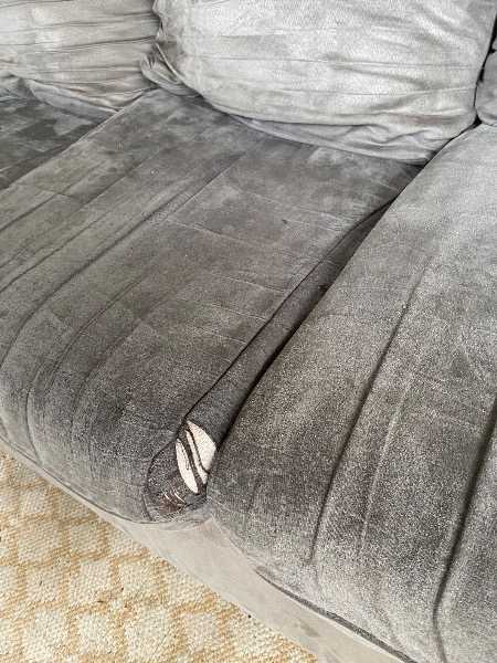 Comfortable and loved, comfortable suede couch. Cleans up pretty well, from a home with dogs. Two small tears, one from the dog sitting atop the back cushion, one on a seat cushion.