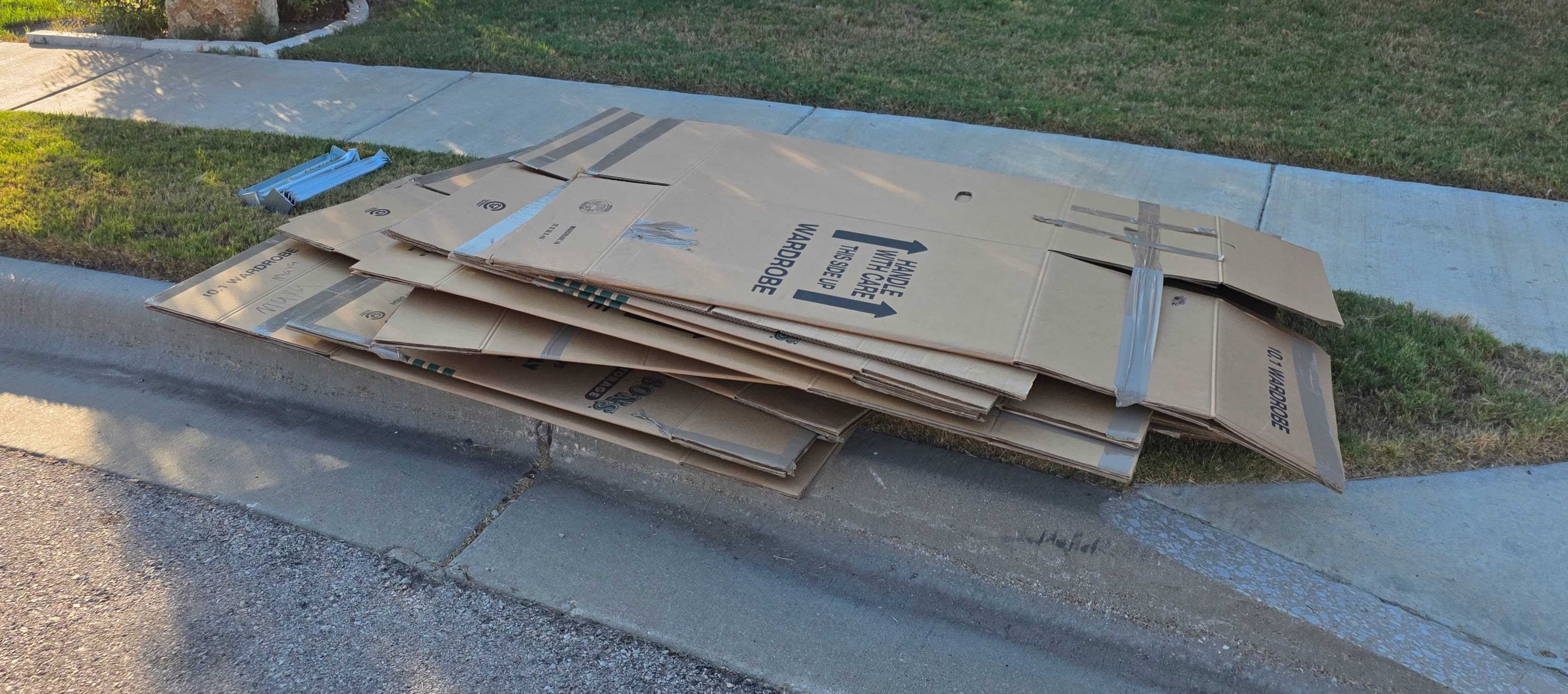 Lots of free moving boxes from All My Sons. Includes those dedicated to wardrobe hangers.