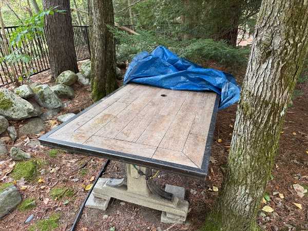 Outdoor table, ceramic wood grain top, metal edges.  82x42.  Heavy, need 2 strong people to move.  Pickup by 10/11 required.