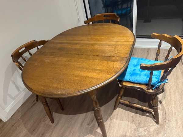 Wooden table and 3 chairs from the 70s, 40 wide x 49.5 long x 29.5 high. Legs come off when moving.
