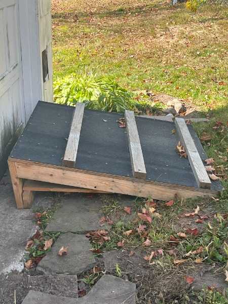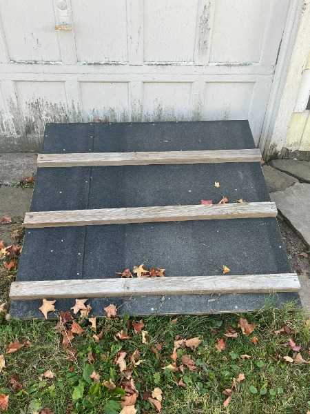 Large and heavy ramp for dogs who need some help getting in and out of the house; would also work for wheelchairs or walkers if the surface slats are removed. Ramp surface has tar paper and 2"x2" slats for traction and to stop or prevent sliding. Approximate dimensions are 12" high, 40" wide, and 40" long, sloping at a 45 degree angle.