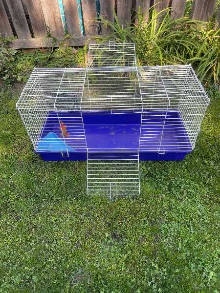 Dimensions 40"x17"x20". Comes with hay rack and corner toilet pan. Opens top or side. Metal part comes off bottom (ppperfect for safely grazing in the yard)