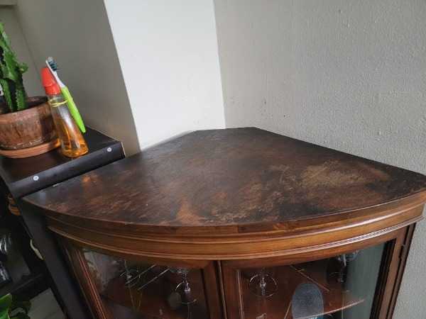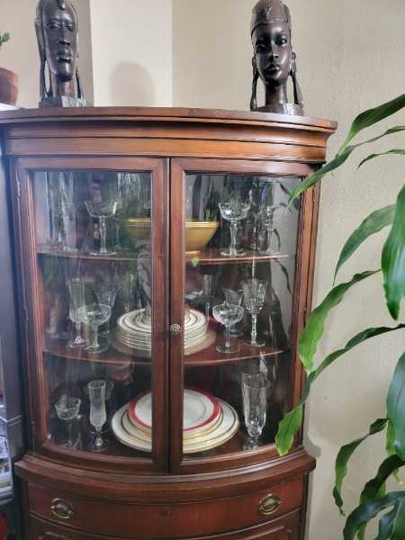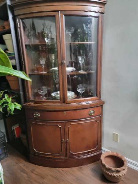 Beautiful antique mahogany china cabinet (with triangulated back to fit into corners -- see photo taken from above unit) is suitable for an apt as well as a house. Has both display and storage space. Will need 2 people to carry.