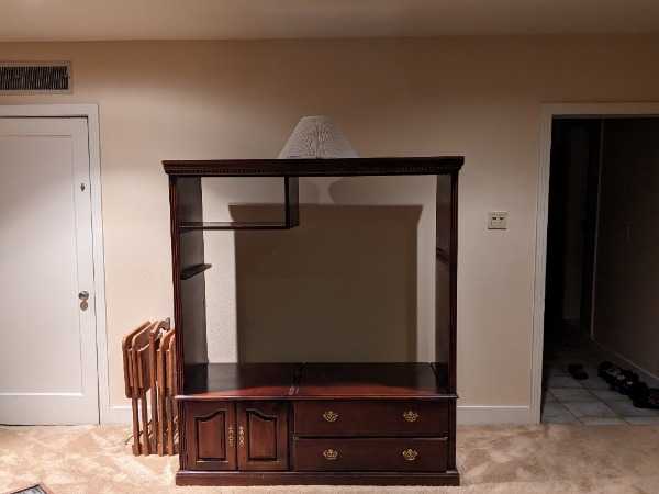 Offering a sizable wooden TV hutch for a large flat screen TV with drawers and cabinet. Great condition, partially modified. Needs reassembly.