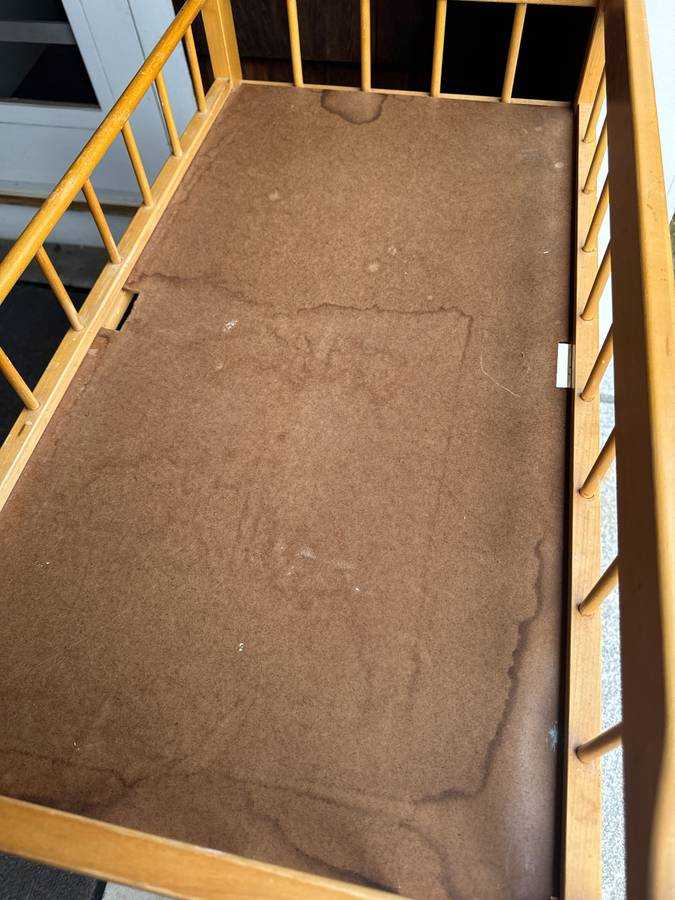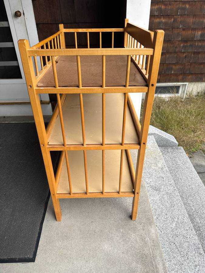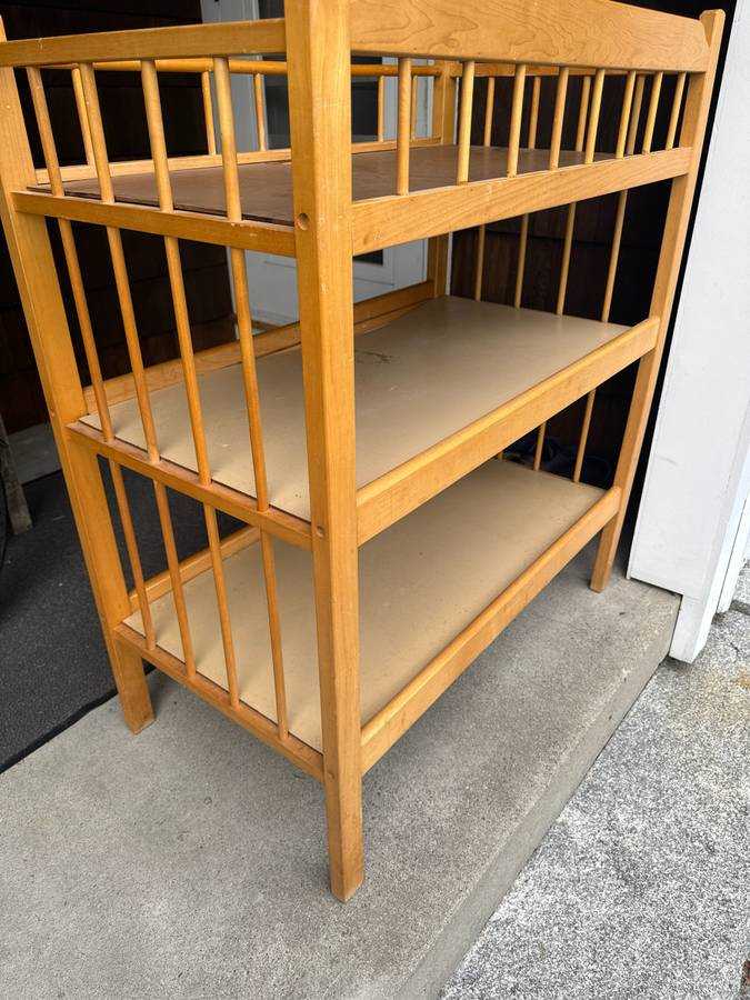 Old style, solid wood frame sturdy changing table. The pressboard shelves would need to be reinforced or bent before use with the baby. See pictures. Please reply with text-able cell phone and pick up windows.