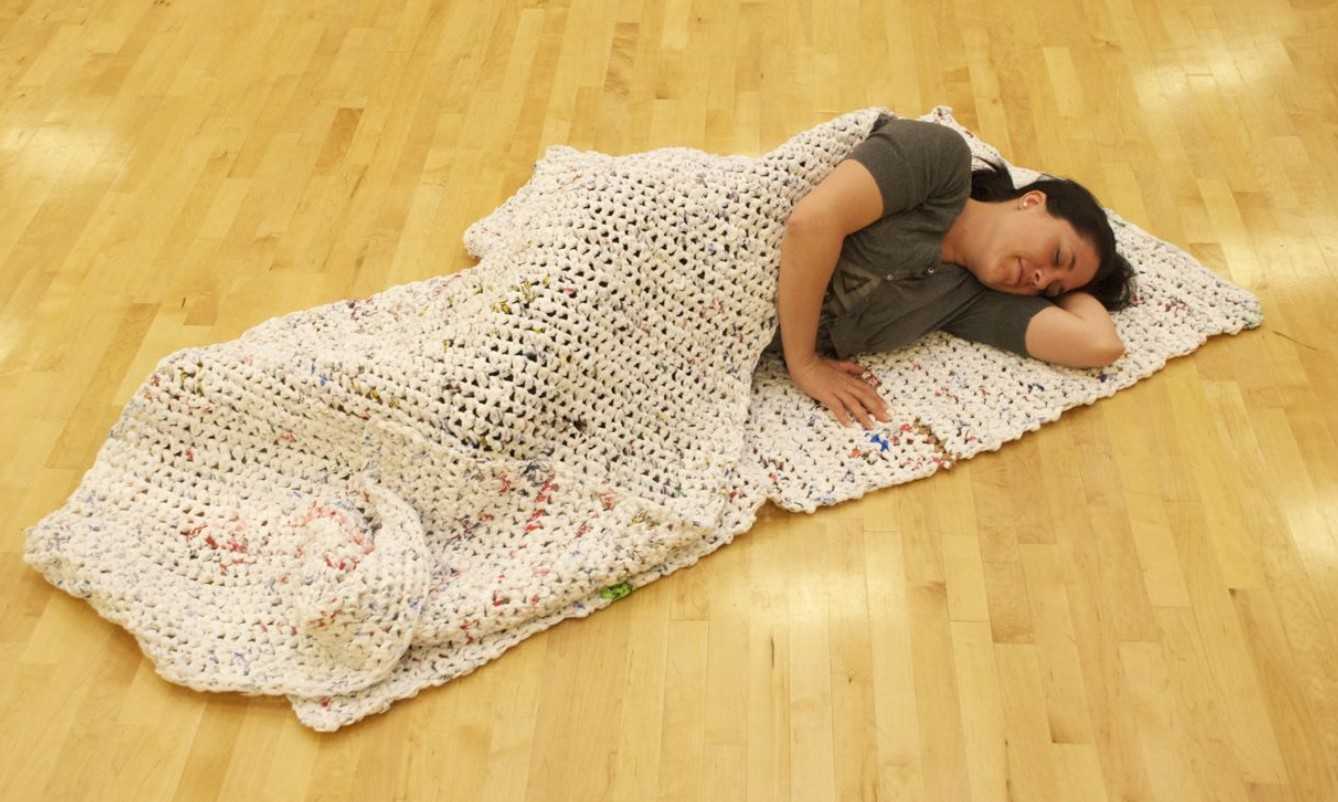 It takes 500 plastic bags to create a 6-foot mat, which can also be folded into a pillow.