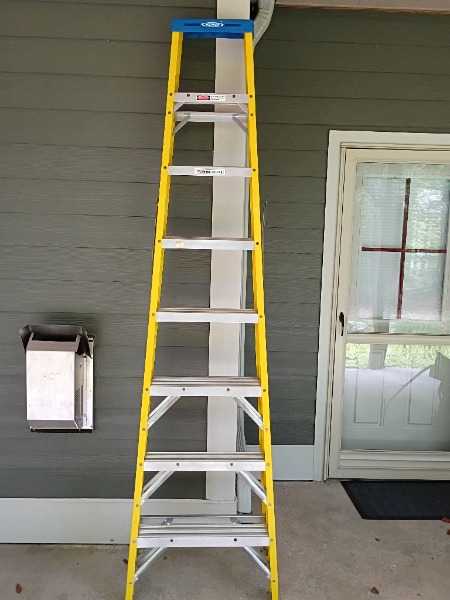 Free 9' Werner fiberglass step ladder. One of the side hinge spreaders is slightly bent making the ladder a little wobbly. A handy person should be able to fix it.
