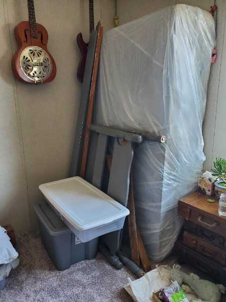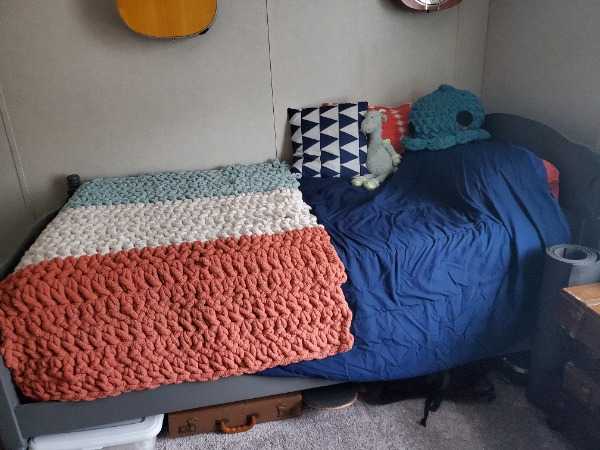 Cat free, extremely clean house. No need to worry about biohazards/bedbugs/lice. Lightly used in a spare bedroom. Includes comforter, sheets, mattress, box-spring, bedframe, and decorative pillows (including cute octopus guy that I made). Doesn't include striped blanket. Everything is packaged and ready to go. You are welcome to take a look at it before taking it. Pick-up only.