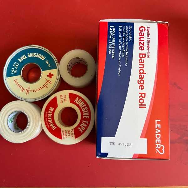 4 partial rolls of bandage tape and almost full roll of gauze. Gauze has been opened so no longer sterile.