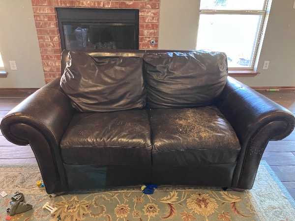 free leather couch. it's got a ton of life left but has cat scratches and other signs of wear. it's very comfy. we are moving and can't take it with us.