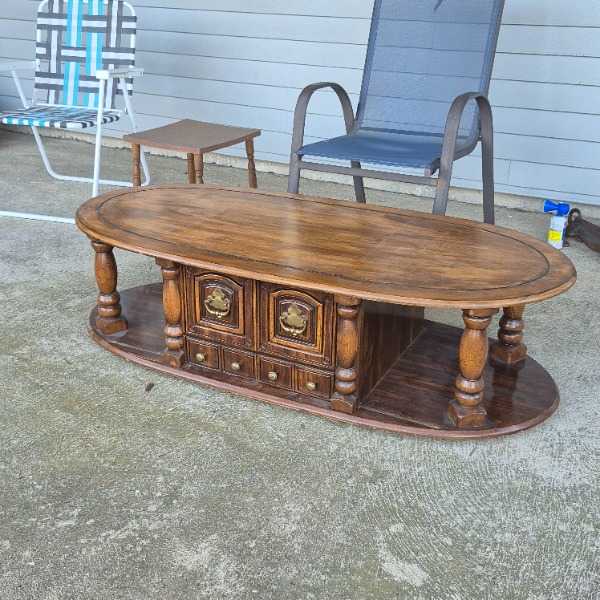 Coffee Table measures 53" x 22" x14".  Wood.  Will need two people to pick up.  Doors on the front open for storage.  Please respond with pick up day and approximate time.  Located in the M section not far from Bowie High School.