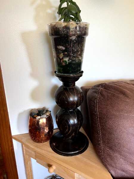 Bought this beautiful piece but now need to downsize. I use it as a plant platform to elevate my plants but you can use it for large candles or anything else you can imagine. Plant is not included.