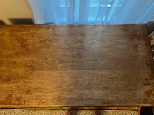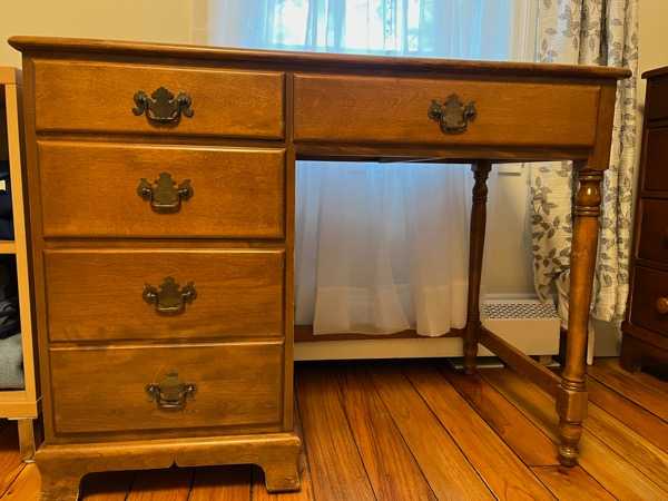 Solid wood desk, well-built (dove-tailed drawers, no fiberboard), 40" wide x 21" deep x 30.5" tall.  The finish on the top was sanded down but is smooth (see photo).  If interested, please advise of when you can pick it up.