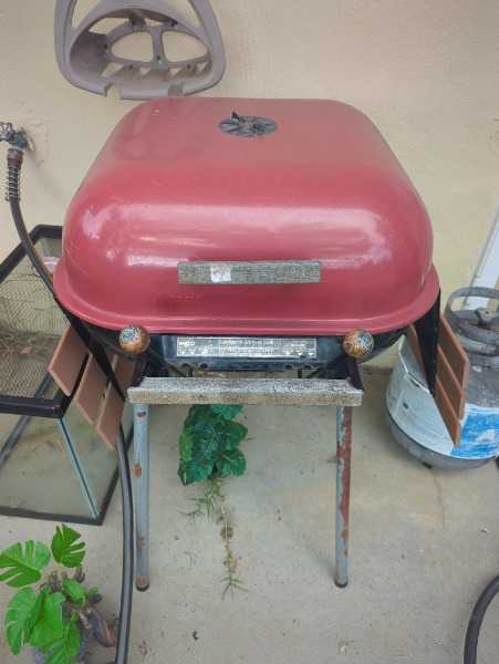 Needs a good cleaning, two sides fold down for easier storage. Comes with a bit of charcoal and apple wood sticks. Porch pick up.