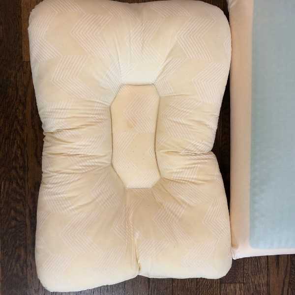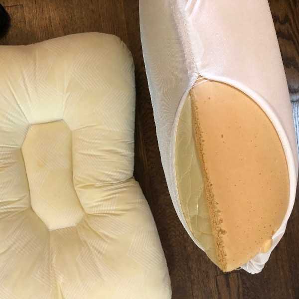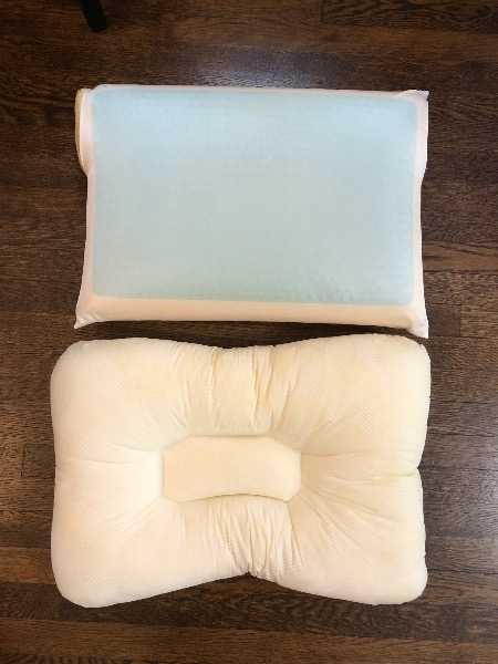 Two pillows, one with small stain and one with the case fabric slightly torn. Otherwise in great condition-- one is super cushy thick memory foam, the other is diveted for neck support. Failed neck pain experiments. Would make really nice small pet beds!