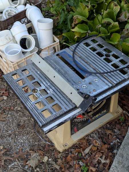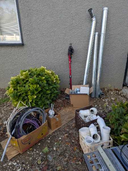Electrical wire and ceiling boxes, HVAC pipe and fittings, sch 40 plumbing fittings, Delta table saw (fence NR), small corded floor sweeper, lawn fertilizer (some unopened).