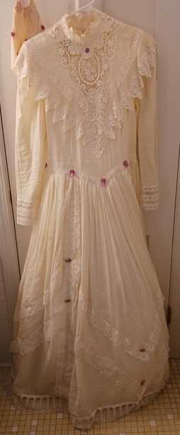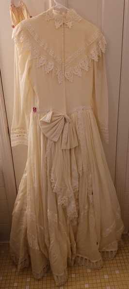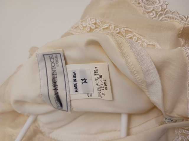 Size 14, made by Jessica McClintock. It has been hanging in the closet for about 30 years and I don't think my wife could fit into it again. Also includes a matching hand bag.