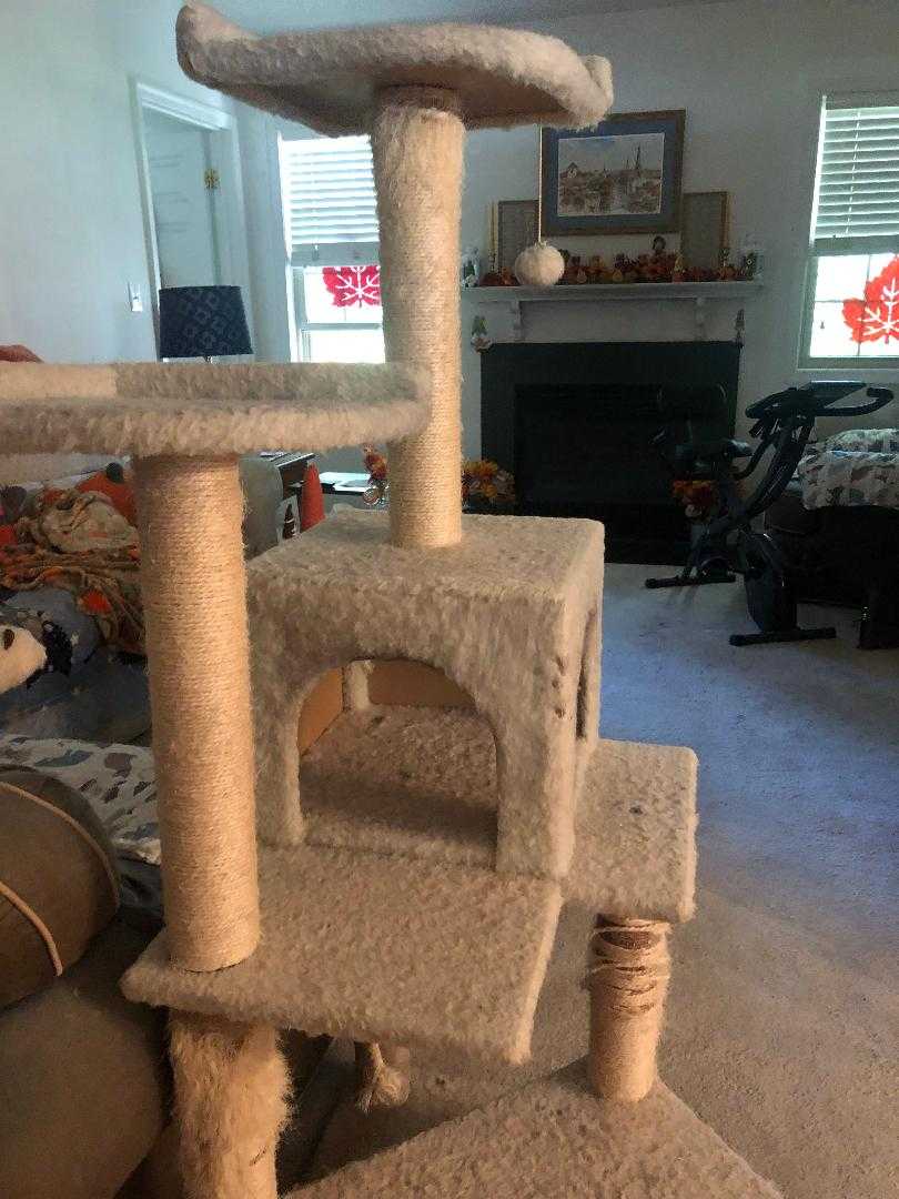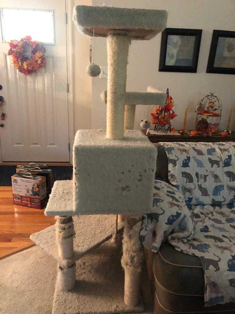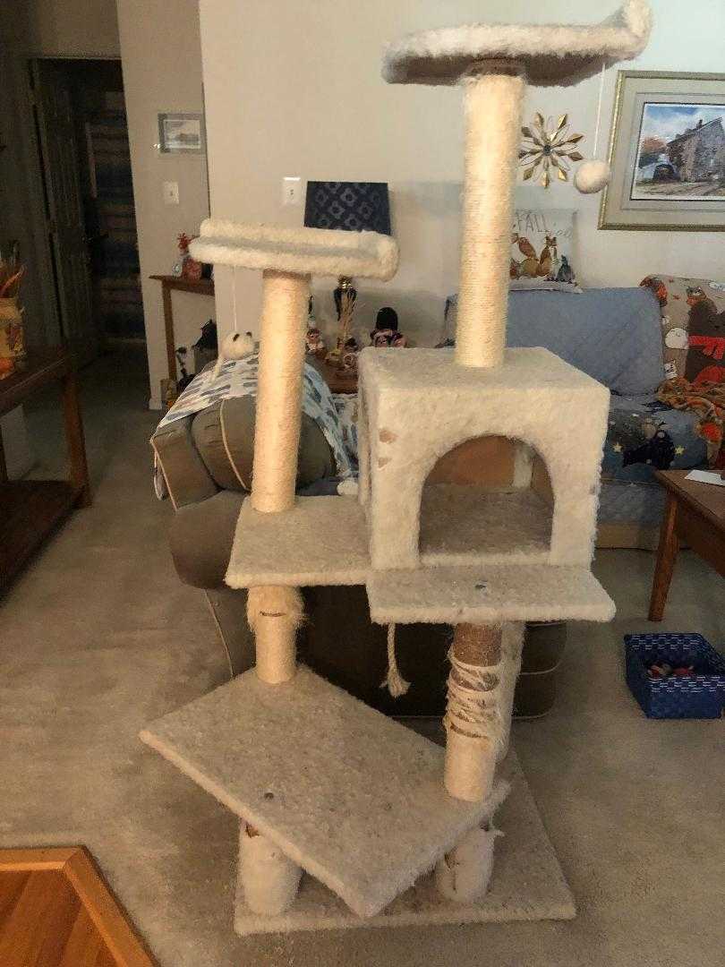 Can anyone use this cat tree? Cat who used it is now deceased. Other cat has no interest in it. approximately 57" high, 34" wide Take as is. Needs some repairs - like new carpet and jute on the posts. One post is loose and needs to be tightened. Rest of the tree is sturdy. It is heavy so will need 2 people to move it.