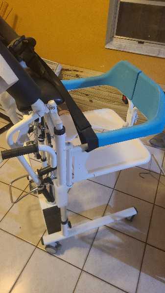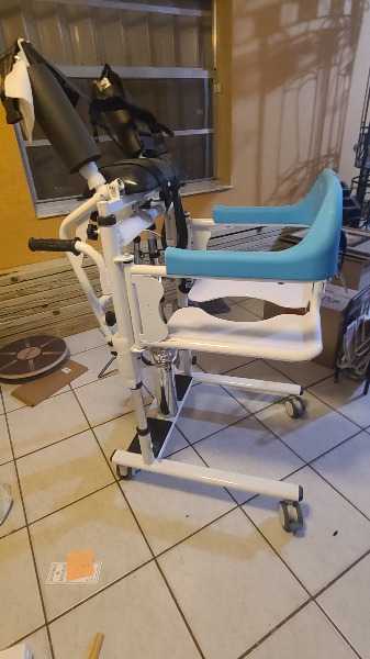Hydraulic patient lift chair. Works to transfer to shower, as a transport wheelchair. Opens in the back. Max 350Lb capacity