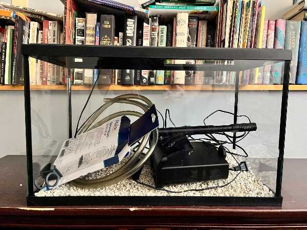 10 gallon aquarium with LED cover, gravel, filter, and gravel vacuum. I was told by the person who I got it from that it doesn’t leak, but have not tested it myself.